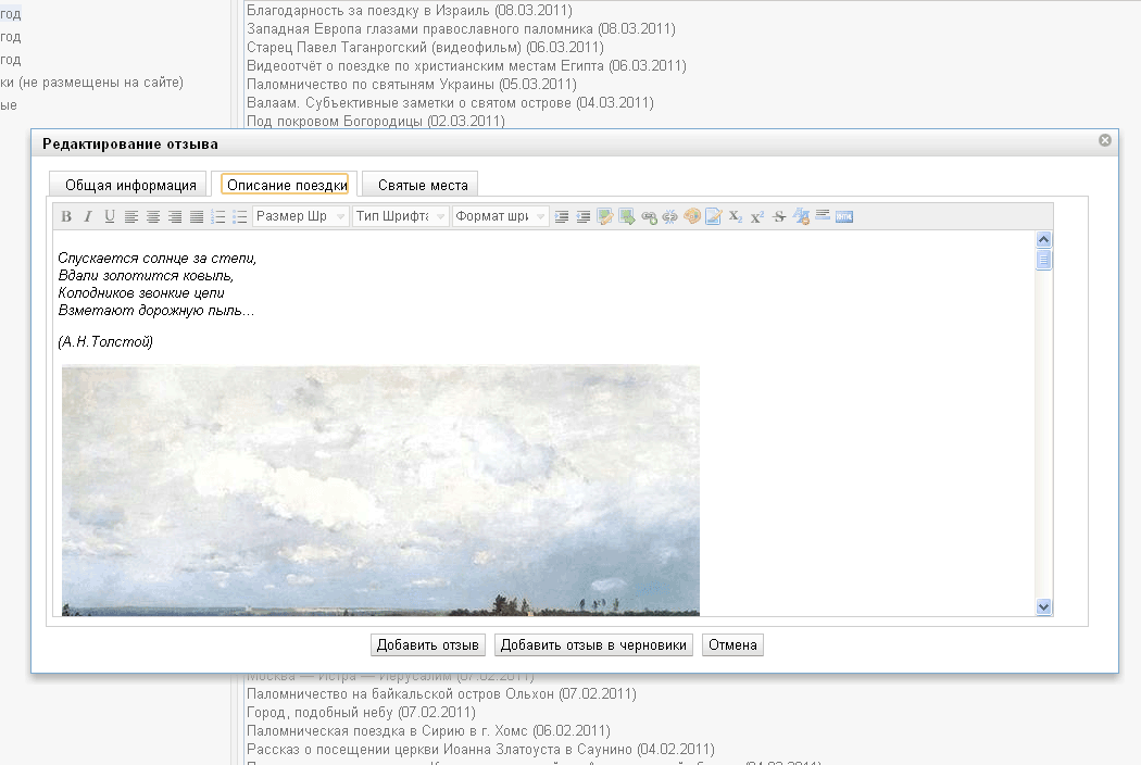 Святые местаВ этой вкладке можно задать для своего отзыва список святых мест, посещенных в процессе паломничества.