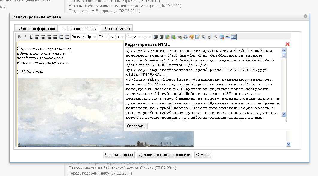 Выбрать святое место - в этом случае святыня добавляется в число святынь, связанных с данным отзывом и копируется в список справа