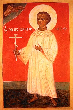 Подозреваю, что без уточнений (например век жизни святого и примерный регион) правильных ответов может быть несколько. Мне например сходу вспомнился Гавриил Белостокский, соответственно город Белосток и католическая страна Польша.