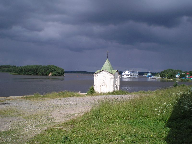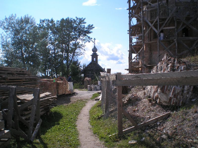 Дале пешком возвращаюсь в Кириллов. Прохожу переправу у канала, трапезничаю у магазинчика. Длинная прямая дорога, мимо автостанции, заканчивается у Кирилло-Белозерского монастыря. Начинаю его осмотр. Громаднейшая территория. Монастырь как бв в два "яруса". Самый внутренний – тот и есть сам монастырь. В храме мощи прп Кирилла Бело-зерского. Канун Рождества Иоанна Предтечи. Заявляю о себе в храме. Меня ведут к настояте-лю, тот благословляет в "странноприимный дом" – местная паломническая. Паломническая весьма убогая, на две половины – мужскую и женскую. Вода из умывальничков, нужно но-сить… Определяю вещи, заряжаю телефоны, просушиваюсь. Стоим Всенощное бдение Рожде-ства Иоанна Предтечи, затем трапеза. В паломнической выдержка из "Апостола" – принимать до 3-х дней во Славу Божию, а затем по трудовому послушанию. Из братии запоминается рБ Александр, который тут проживает для прохождения процедур в местной больнице. У него т.н. трофическая язва на ноге, он сильно страдает. После вечернего правила пробую его "лечить" по четкам – 150 "Отче Наш"… 7.07. Вторник. Утро – Литургия и причастие. Всей братии монастыря аж три монаха во главе с игуменом Игнатием…Да и один послушник, бойкий мальчик Антоний… После литур-гии трапезничаю и выдвигаюсь в район Вологды. Планирую встать в Новленском и прояснить пути переправы на противоположный берег Кубенского озера через Спас Каменный, либо про-сто поснимать и двигаться через Вологду на Устье… Фото Кирило- Белозерского и так хорошо известны, так что их не выкладываю В Новленском примерно в 13.30. Ищу лодку вдоль речки Ельма. Из разговора с моло-дежью, выясняю, что в селе прошла бурная ночь "накануне Ивана Купала" и все спят. Телефон-ные звонки знакомым ничего не дают. Мне советуют пройти в село Коробово в 3 км, это прямо на берегу Кубенского озера, может там что-то выйдет. Расспросы в Коробово безрезультатны. В одном месте строится сруб дома, спрашиваю мужиков, кто бы проехал на Спас Каменный. Все шутят, а один человек вызывается. Звать Сергеем, примерно лет 40-45. Сам он из Вологды, уроженец Коробово, сейчас у него участок в селе, обнесен каменной стеной, кулисные двери открывают въезд на территорию. Иномарка-джип. Приглашен на обед, после едем за бензином, заряжаем 50 л. плюс масло. С меня 1300 руб. Вот все и готово. Сергей жалуется , что ночью кто-то увел его лодку, еле нашел… Последствия сельской гулянки. С собой Сергей берет жену Ольгу, дает куртку, что очень кстати, скорость приличная да и ветер свеж. Пересекаем Кубенское озеро, Спас Каменный красиво вырисовывается из вод… На острове встречает нас злой пес, все время лает и пытается броситься. Жилое строе-ние одно – там музей обители, найденные там раритеты, крест с колокольни, остатки колоко-лов, иконы… Восстанавливается колокольня, на ней слабо копошатся трое рабочих. Действует часовня. Мощи прп Василия Спасо Кубенского погребены под руинами взорванного Спасо-Преображенского Собора… Один из рабочих спускается к нам, показывает музей, отгоняет пса, который уже успел порвать мне зубами сумку. Он жалуется, что в этом году вовсе нет финан-сирования, работы стали, так что и туго даже с продуктами. Ездить приходится далеко за 8 км в Устье… Отправляемся дале на Устье. Входим в устье реки Кубины, на правом берегу крупный поселок Устье, а напротив село Чирково с красивым погос