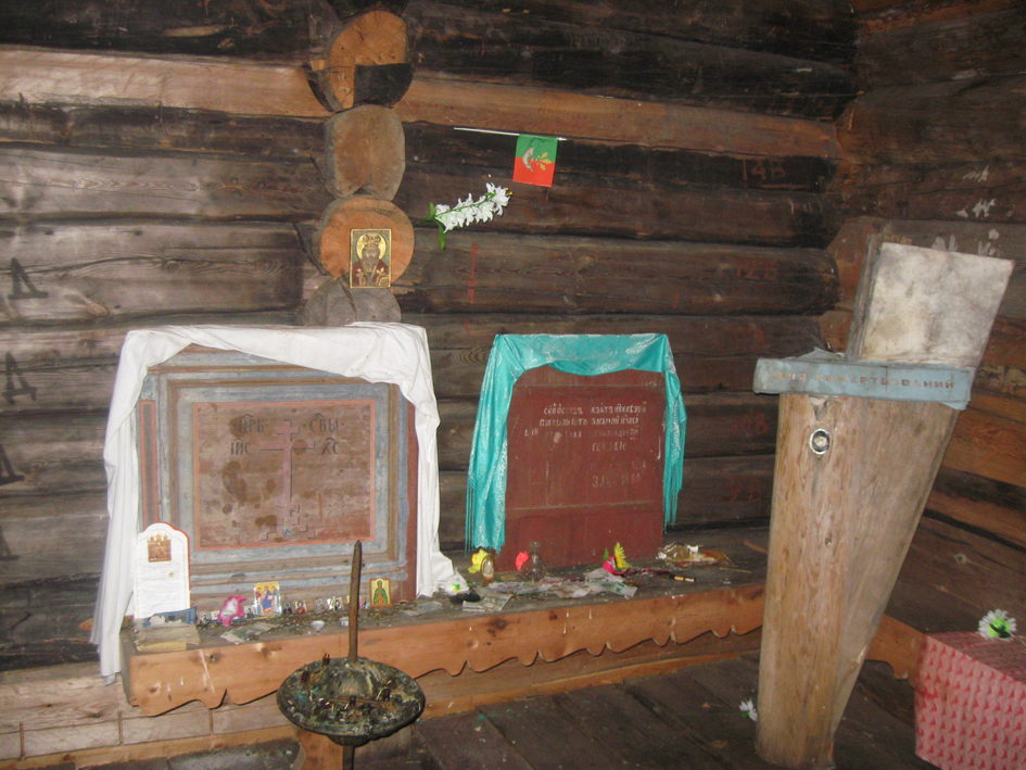 В ней 2 больших старинных резных креста, расписанные старославянскими узорами.