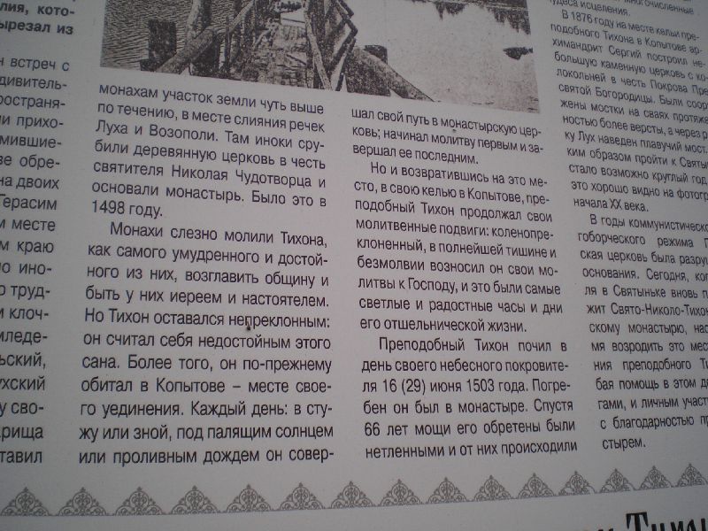 Преподобный Тихон Луховской, Костромской (в миру Тимофей), родился в пределах Литовского княжества и был там на военной службе. В 1482 году, не желая принимать униатство, он ушел из Литвы в Россию. Святой раздал все, что имел, принял постриг с именем Тихон и удалился в Костромскую епархию, в Луховские земли. Город Лух был отдан тогда князю Феодору Бельскому, вместе с которым преподобный Тихон пришел из Литвы. На берегу в урочище Копытовке преподобный Тихон поставил келлию. Когда к нему в пустыню пришли два инока, Фотий и Герасим, преподобный ради них перешел за три версты от Копытовки, на более удобное место. Подвижники добывали пропитание трудами рук своих. Преподобный Тихон искусно переписывал книги, был хорошим токарем. По смирению он так и не принял священства. Скончался преподобный Тихон 16 июня 1503 года, в такой бедности, что ученики не знали, в чем его погребсти. Но к их утешению Суздальский архиерей прислал подвижнику свитку, в которой его и предали земле. Вскоре после его смерти на месте его подвигов устроилась обитель в честь святителя Николая Чудотворца.