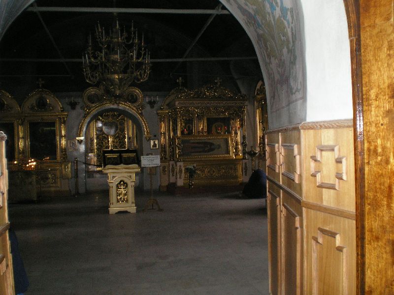 Прп Тихон подвизался в "столпе". Этот столп и виден на фото... Там была маленькая келлийка прп. Пристройка к храму - место положения мощей прп Тихона. Попасть к мощам, да и на столп не удается, нужно "благословение", ну а настоятеля как полагается нет... Кстати, в храме интересная икона "Трех радостей", копия московской, ее чтут