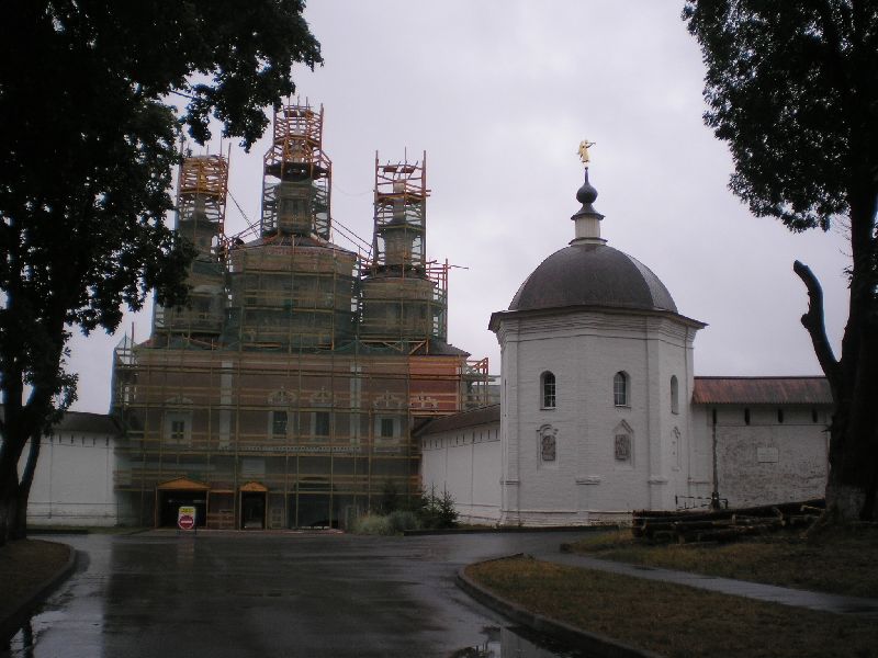 Прп Тихон подвизался в "столпе". Этот столп и виден на фото... Там была маленькая келлийка прп. Пристройка к храму - место положения мощей прп Тихона. Попасть к мощам, да и на столп не удается, нужно "благословение", ну а настоятеля как полагается нет... Кстати, в храме интересная икона "Трех радостей", копия московской, ее чтут
