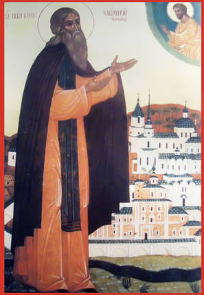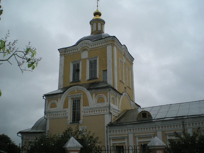 Прп Тихон подвизался в "столпе". Этот столп и виден на фото... Там была маленькая келлийка прп. Пристройка к храму - место положения мощей прп Тихона. Попасть к мощам, да и на столп не удается, нужно "благословение", ну а настоятеля как полагается нет... Кстати, в храме интересная икона "Трех радостей", копия московской, ее чтут