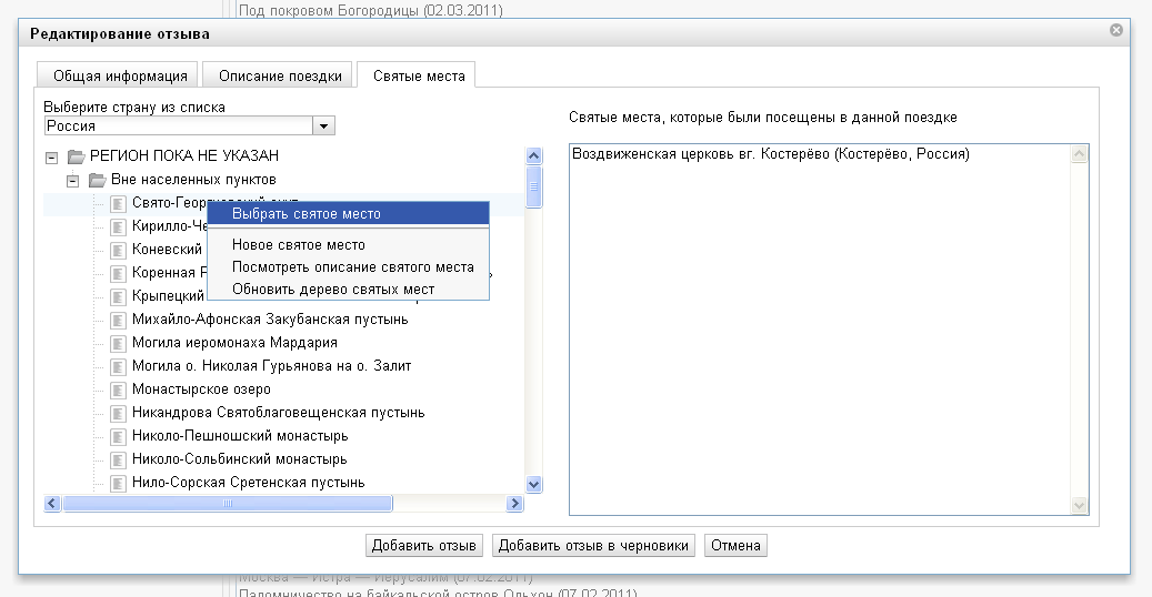 Выбрать святое место - в этом случае святыня добавляется в число святынь, связанных с данным отзывом и копируется в список справа