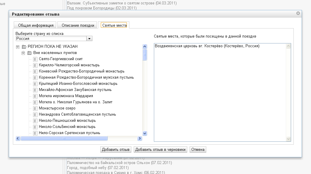 В этой вкладке можно задать для своего отзыва список святых мест, посещенных в процессе паломничества.