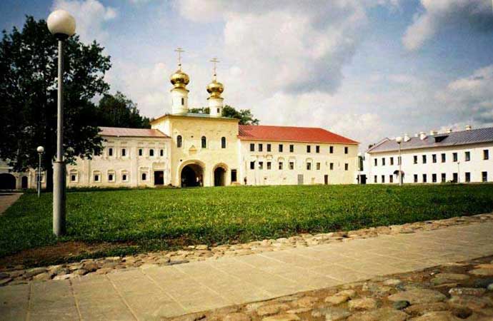Центральным и первым по времени сооружением архитектурного ансамбля монастыря, формировавшегося на протяжении четырех веков, является Успенский собор с Никольским приделом, построенный в 1507-1515 годах московским мастером Фрязиным и новгородским строителем Д. Сырковым. Собор, дважды перестроенный в XVII и XVIII веках, почти утратил свой первоначальный облик. Четырехскатная металлическая кровля закрыла ряды крытых тесом закомар и кокошников и уменьшила высоту глав, а их шлемовидные завершения сменились луковичными. Последние изменения в облик собора были внесены в 1822 году, когда со стороны главного фасада были пристроены еще два придела. И все же, несмотря на это, Успенский собор - ценнейший памятник древнерусского зодчества. Проведенные исследования позволили выполнить проект его реконструкции (архитектор А. Н. Милорадович), но восстановление первоначального облика затруднено большим количеством поздних наслоений, также имеющих определенную историческую и художественную ценность.