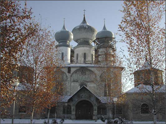 Успенский собор был закрыт. Работала лишь церковная лавка. Увидев нас, заглядывающих через окно вовнутрь и расстроенных такой неудачей, женщина, работающая в лавке, открыла для нас двери в собор. Она охотно рассказывала нам о просветляющихся фресках собора и об ожидаемом возвращении чудотворной Тихвинской иконы. Тогда казалось, что это событие будет нескорым. Несмотря на следы бывшего прежде запустения, стоящие строительные леса, внутри собора ощущалось спокойствие, соответсвующее его величественности и той благодати, которая несомненно присутствовала, раз чудодейственная святыня стремилась вернуться к нам в этот собор.