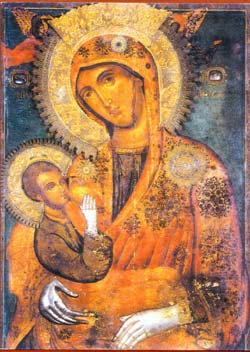 Карея важна еще и тем, что здесь хранятся несколько величайших святынь: икона Божией Матери «Достойно есть», возле которой Архангел Гавриил записал на камне перстом молитву «Достойно есть», и икона Божией Матери «Млекопитательница», по преданию написанная Евангелистом Лукой с Самой Царицы Небесной. Вторая икона хранится в сербской постнице. Это место для наиболее строгого уединения и молитвы. Там «дежурит» серб-иеромонах (к сожалению, не записал его имени). Это веселый, доброжелательный человек (на Афоне, впрочем, преобладающий тип - человека доброжелательного, отнюдь не угрюмого). К тому же, сербы и русские здесь друг друга поддерживают - как славяне и как меньшинство в сравнении с греческим большинством на Афоне. Он провел нас к главной святыне и удалился, давая понять, что не хочет мешать нашей сокровенной молитве. Икона поражает! Царица Небесная в своем неземном величии словно застигнута Евангелистом Лукой в казалось бы самую свою «земную» минуту - кормящей грудью Младенца Христа! Это «человеческое», близкое нам, делает образ особенно теплым, родным. Хочется молиться и молиться - отнюдь не только «за мир», - а о своей семье, о себе, о детях... Именно возле этого образа особенно явственно ощущаешь, что Царица Небесная - Матерь всего страждущего человечества... И как любящая Мать, Она прощает, помогает, плачет от наших грехов, приходит на помощь... В Ее глазах столько любви, сочувствия, столько невысказанной грусти, что как-то съеживаешься при мысли, что так печалишь Ее еще и своими грехами и слабостями... Эта икона - одна из самых ПРОНЗИТЕЛЬНЫХ, «человечных», из многих чудотворных икон, открывшихся нам на Афоне!