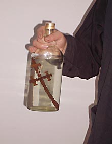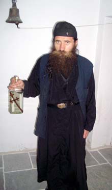 Ставим свечи, пишем записочки. И вот уже добродушный серб появляется с рюмками «анисовки», лукумом и стаканами холодной воды - традиционный афонский набор для приема путников. У нас с Сергеем Федоровым это уже не первая остановка в маршруте. Несколько рюмок уже выпиты в других гостеприимных обителях. Силен соблазн на этот раз отказаться. Ведь для чего придумали этот обряд? Большинство паломников ходят по Афону из монастыря в монастырь пешком. И «анисовка» способна освежить путника, который за день не в силах обойти более двух обителей. Мы же ездим на автомобиле. И потому слишком частые рюмки как-то начинают смущать нас. Но сербский священник улыбается и продолжает настаивать на своем. Таков закон гостеприимства. Он удаляется куда-то и возвращается с целой бутылью в руке. Что-то говорит на смеси русского, греческого и сербского. Наш провожатый, отец Виталий, переводит это так: «Не смущайтесь, в моей бутылке совсем нет «зеленого змия», - и показывает бутыль с узким горлышком, в которой... большой деревянный крест! Остается загадкой, как он смог поместиться туда (видимо, сербский монах собирал его в бутылке пинцетом, - высказывает предположение отец Виталий). Из детства помню небольшой милый фокус с огурцом в бутылке - который растет прямо там до нужных размеров. Но чтобы вырос... крест!.. Раз бутылка с крестом - отказаться от рюмки мы не можем. Дружно пьем «анисовку» («раки» по-гречески) и идем в сербскую костницу.