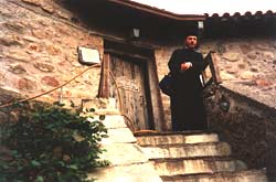Монастырь преподобного Варлаама - следующий на нашем пути. К этому уже успели подъехать к монастырским стенам автобусы с интуристами-европейцами - немцами, итальянцами и другими. Вездесущие торговцы сувенирами (так и хочется сказать "матрешечники", хотя здесь, в Греции, у них, разумеется, свой национальный ассортимент) уже встречают их, разложив свой товар. Начинаешь понимать, как нелегко современной братии и сестрам подвизаться в таких условиях всеобщего обозрения. Но ведь и обитатели секулярного мира, посещая действующие монастыри, получают видимое свидетельство о Христе, и, наверное, поэтому Господь попускает, чтобы по священной метеорской земле проходили шумные туристские толпы.