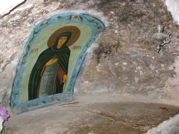 Но самое большое открытие нас ожидало в конце, когда мы уже почти обошли по кругу пещеру и поклонились всем погребениям святых. В нише последнего гроба была написана икона, на которой было всего два слова «Святая Мария». Мы стали выяснять, что это за Мария? Рядом с гробом табличка на греческом языке извещала, что это гроб «Прпп.Ксенофонта, Марии и чад их Иоанна и Аркадия». Меня охватила радость - ведь это небесная покровительница Игумении Таисии в миру. Родительница матушки Таисии Виктория Солопова в благодарность Божией Матери решила посвятить и назвать свою дочь именем Пресвятой Богородицы. Но имя Самой Божией Матери никто не может носить. И у Марии Солоповой небесной покровительницей являлась прп.Мария, память которой совершается в церкви 26 января ст.ст. (8 февраля н.ст.) Именно этот день праздновала матушка Таисия как день ангела, причем помнила его и будучи уже игуменией Таисией. Сохранилось даже поздравление Иоанна Кронштадтского матушке Таисии именно в этот день. В этот день я всегда стараюсь служить Литургию на Леушинском подворье. Признаюсь, никогда не задавался вопросом, где же находятся мощи небесного ангела Таисии. И тут такое неожиданно и радостное открытие.