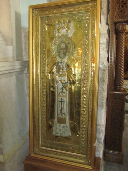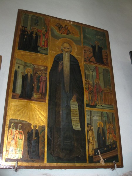 Здесь мы обратили внимание прежде всего на большую и украшенную позолоченной ризой икону прп.Сергия Радонежского, которая напоминает образ в Сергиевой лавре, износимый каждый год на крестный ход в день памяти прп.Сергия. Эта икона является даром великого князя Сергия Александровича. Правда, как пояснил наш путевод, в греческих храмах плохо знают наших святых, в том числе и Сергия Радонежского. В основном знают Серафима Саровского и Луку Крымского. «Не уверен, что, прикладываясь к образу, насельнцы знают, кто он такой».