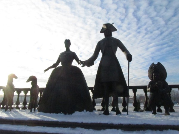 Как не почтить Петра с Екатериной! Повернув после Константиновского дворца направо, мы проехали мимо Путевого дворца Петра Первого прямо к берегу. В полном одиночестве на фоне бескрайнего снежного пейзажа замерзшего Финского залива стояла необычная скульптурная группа императора Петра Первого со своей супругой. Петр был вытянут по вертикали как мачта, а его супруга одета в широкий кринолин, как парус на ветру. К ним с одной стороны жались две бронзовые борзые, а с другой стороны ухмылялся карлик-шут, которого шофер принял за царского дитя. Композиция напоминала скорее театральную сцену торжественного приема или начала бального танца. В любом случае, выглядело все по-царски празднично. К тому же, как потом я узнал, - это единственный памятник Императрице Екатерине Первой. Автором скульптуры, сооруженной к 300-летию Санкт-Петербурга, оказался Михаил Шемякин, оскандалившийся другим памятником царю в Петро-Павловской крепости.