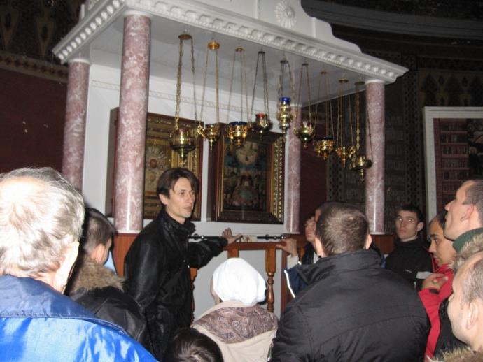 Здесь же после службы произошло неожиданное знакомство с дочерью новочеркасского поэта Владимира Калмыкова. Женщина обратила внимание на необычную группу людей и пригласила их в дом-музей своего отца, в котором как раз сейчас проходит выставка «Святая Русь». Как оказалось, поэт последние 17 лет своей жизни был прикован к постели, но при этом не падал духом и писал жизнеутверждающие стихи. Гостям из Ростова дочь поэта тоже посоветовала не отчаиваться, с удовольствием прочитала им свои стихи. И тут произошло маленькое чудо. Одна из подопечных сестричества вдруг попросила разрешения прочитать собственные стихи. - Этого никто не ожидал и не подозревал, что кто-то из пациентов интерната пишет стихи, - признались сестры. - Стихи, надо сказать, замечательные! Для нас это было неожиданное открытие. И вообще, если оценивать нашу поездку по духовным параметрам, то она получилась очень содержательной. Мы видим, как наши подопечные возрастают в вере. После Вознесенского собора группа паломников отправилась в церковь Александра Невского, где их тоже уже ждал клирик храма иерей Михаил Гапоненко. Он провёл их по храму, рассказал о его истории и святынях, а потом была трапеза. Последним пунктом паломнической поездки по святым местам столицы донского казачества стал храм Архангела Михаила.